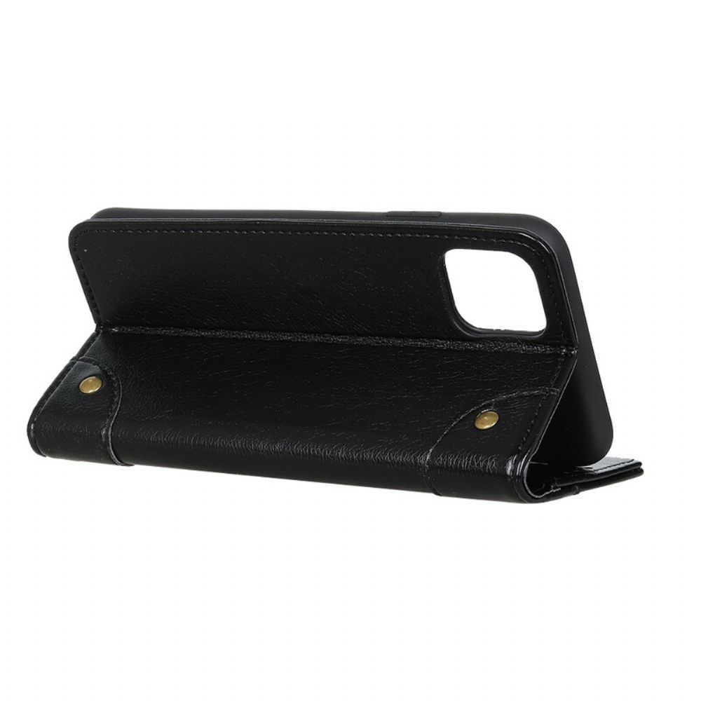 De hoes in nappaleren stijl met vintage klinknagels zet je iPhone 12/12 Pro vast en geeft hem een persoonlijke retro-look.