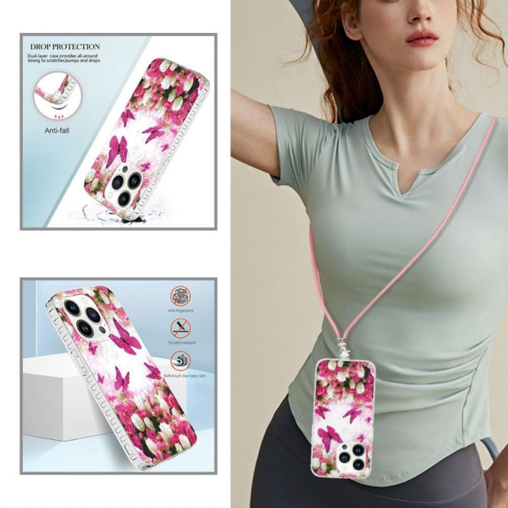 Hoesje voor iPhone 14 Pro Met Koord Gestileerde Vlinders Trekkoord