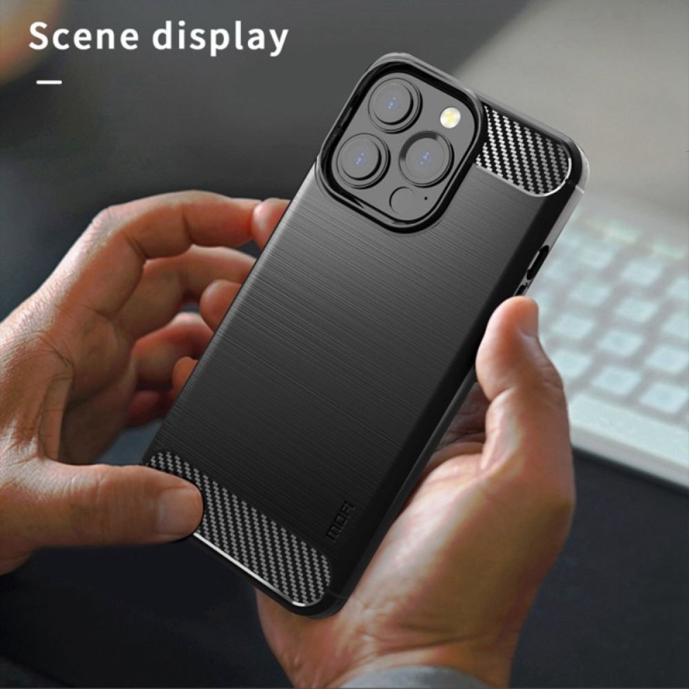 Dit siliconen hoesje met koolstofvezeltextuur van Mofi biedt dunne en optimale bescherming voor de achterkant en randen van je iPhone 14 Pro.