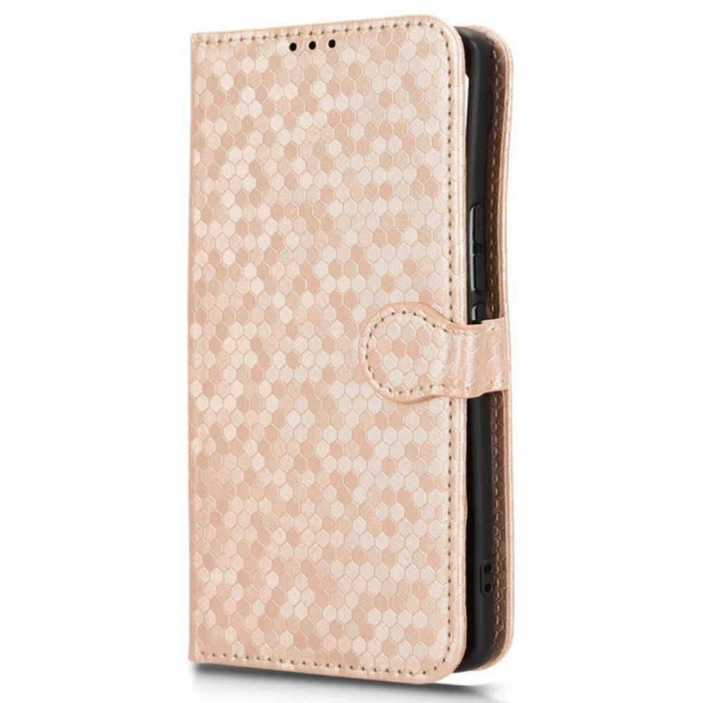 Stijlvolle PU-leren portemonneehoes met reliëf stippenpatroon. Verstelbare standaardfunctie voor optimaal handsfree kijken. Geïntegreerde vakjes voor pasjes en contant geld. Inclusief handige polsband voor veilig dragen.