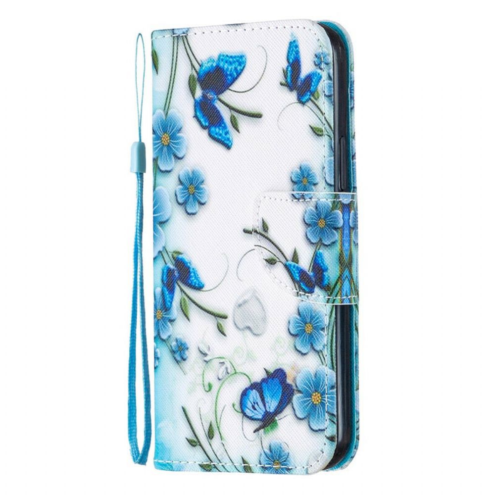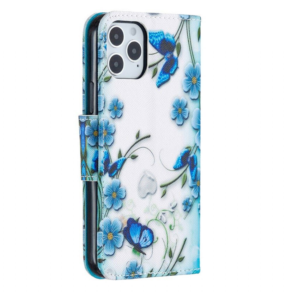 De Blue Butterflies and Flowers-riemhoes beveiligt uw iPhone 12/12 Pro volledig en dient als portemonnee.