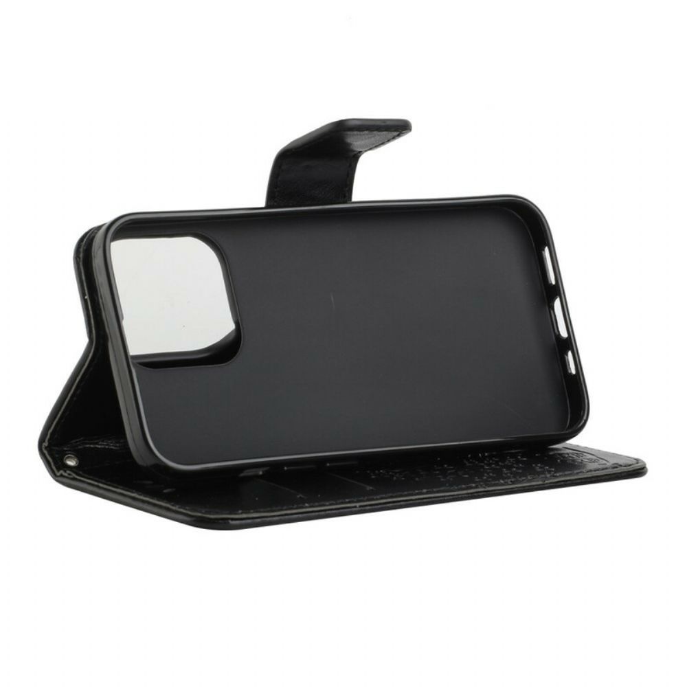 De Leather Effect Tree and Owls-cover, met magnetische flap, beschermt je iPhone 13.